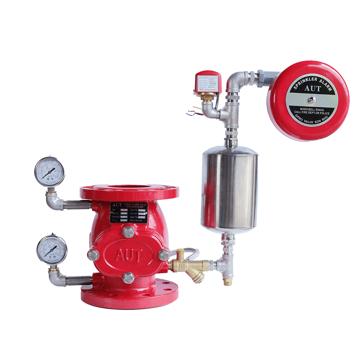 Van báo động AUT (Tên tiếng anh là Alarm check valve) được sản xuất bởi thương hiệu Van AUT là van chuyên dụng cho PCCC. Van được lắp đặt chủ yếu ở nhà xưởng, Chung cư cao tầng,…để báo động khi có đám cháy xả ra. Van hoạt động dựa trên hiện tượng chênh lệch áp suất. Bình thường van luôn ở trạng thái đóng. Khi có chênh lệnh áp suất thì lá van sẽ mở ra. Van có cấu tạo giống với Van 1 chiều AUT dạng lá lật.